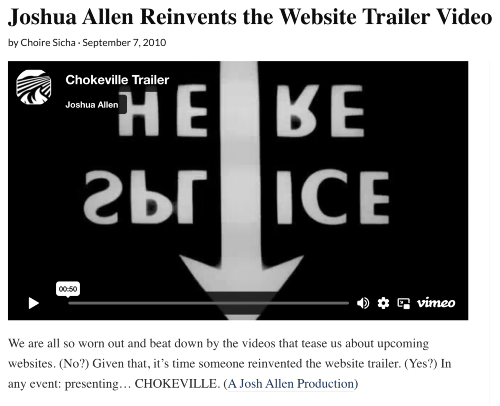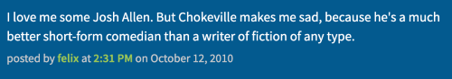 Most prose born on the Internet is highly defensive. Everyone is braced for audience attack and opens their posts with four paragraphs explaining why the remaining four paragraphs are worth reading. Chokeville is not that. It tries to explain itself, but it can’t.